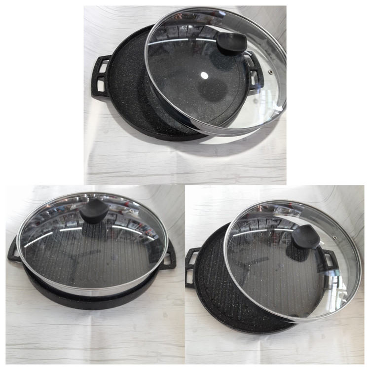این تابه چدنی ،گرانیتی دوطرفه است یک طف آن شیار دار مخصوص گریل کباب و.. ویک طرف آن صاف مخصوص کیک شیرینی و...است